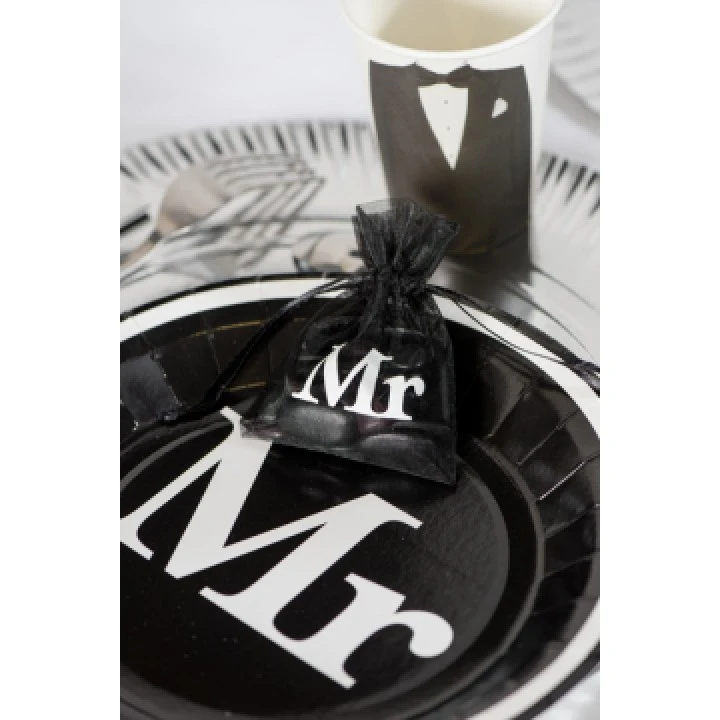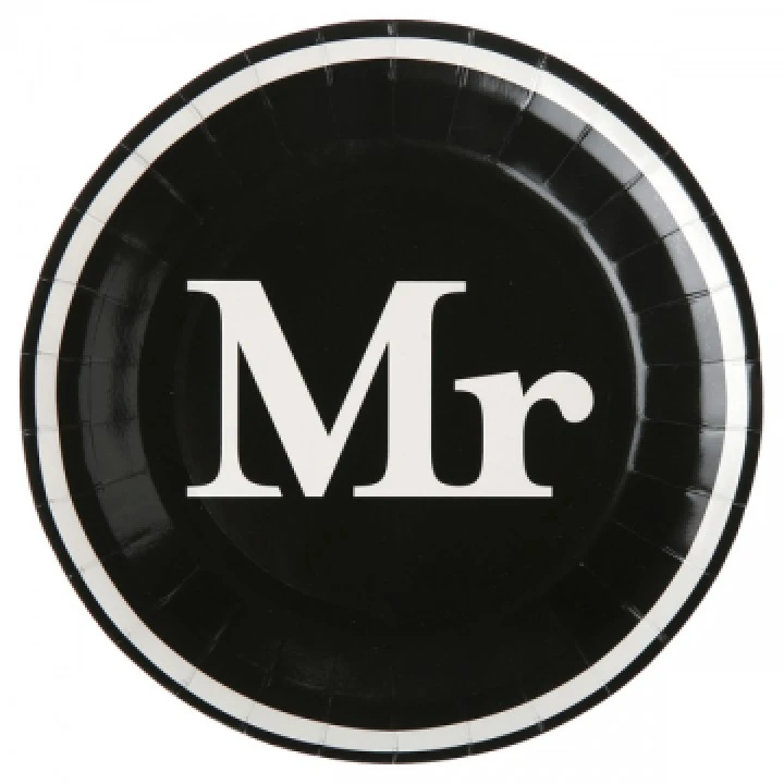 Ce lot de 10 assiettes en carton Mr & Mrs noirs D 22,5 cm sera idéal pour votre déco de table ou buffet de mariage thème noir et blanc. Ces belles assiettes jetables de 22,5 cm de diamètre sont en carton noir avec une bordure blanche et au centre un grand Mr blanc dans une calligraphie tendance. Ces assiettes jetables existent pour Mrs dans un coloris inversé.  Pour faciliter votre organisation et créer une belle décoration de table ou buffet de mariage, vous recherchez des assiettes en carton jetables chic et nouvelles, choisissez ce magnifique lot de 10 assiettes en carton Mr & Mrs noirs D 22,5 cm.
