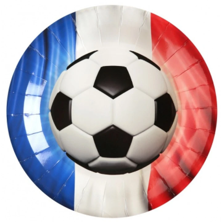 Pour votre buffet de soirĂ©e foot Coupe du Monde 2018, ce Lot de 10 assiettes Champion du Monde 22,5 cm est idĂ©al. Ces jolies assiettes ont un fond bleu, blanc rouge avec au centre un ballon de foot impression 3D.  Ces assiettes jetables seront pratiques, et après la fĂŞte pas de corvĂ©e de vaisselle, et en plus participeront Ă la dĂ©coration de votre table ou buffet de soirĂ©e foot Coupe du monde. Choisir ce Lot de 10 assiettes Champion du Monde 22,5 cm, c’est assurer une dĂ©coration thème foot totalement dĂ©diĂ©e aux Bleus.