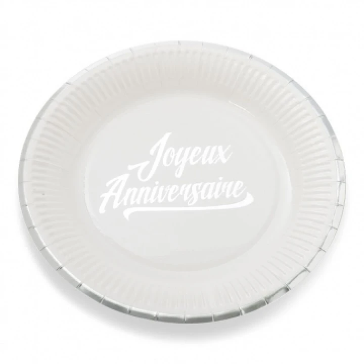 Ce lot de 12 assiettes jetables Joyeux anniversaire en carton blanc et argent D 23 cm sera parfait pour un dĂ©jeuner , une fĂŞte d’anniversaire adulte et enfant dans un thème party chic. Ces jolies assiettes blanc et argent sont en carton blanc avec une bordure argent et au centre l’Ă©criture italique argent de Joyeux Anniversaire. Ces grandes assiettes jetables seront idĂ©ales pour votre prochaine fĂŞte dÂ’anniversaire et participeront Ă la dĂ©coration de votre table , buffet ou candy bar thème campagne chic. Avec cette vaisselle jetable il n’y aura pas de soucis pendant et après la fĂŞte. Choisir ce lot de 12 assiettes jetables Joyeux anniversaire en carton blanc et argent D 23 cm , c’est faciliter l’organisation de votre prochaine fĂŞte d’anniversaire et assurer une dĂ©coration classe et sophistiquĂ©e et tendance.