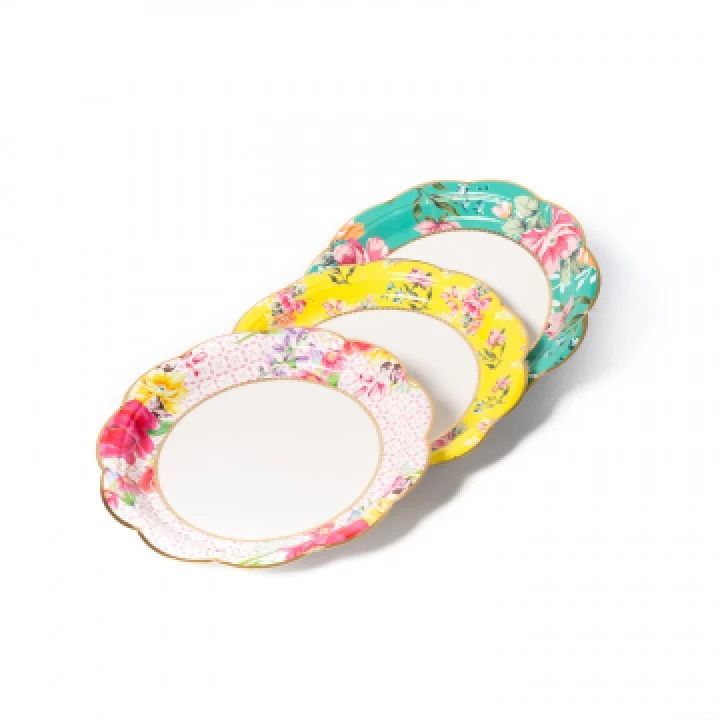 Ce superbe Lot de 12 assiettes Fleuri Tea time en carton 18 cm est parfait pour un anniversaire, un goûter entre amis mais aussi un déjeuner ou un dîner dans un thème So british. Ces assiettes en carton de 18 cm de diamètre feront de très jolies assiettes à dessert, avec leur fond blanc au centre et la bordure fleurie soit sur fond jaune, vert céladon ou motifs géométriques roses, le tout bordé de doré avec une jolie bordure crantée, soit 6 assiettes de chaque couleur. Que ce soit sur votre buffet, table ou candy bar, ce Lot de 12 assiettes Fleuri Tea time en carton 18 cm fera un très bel effet tant la ressemblance avec de la vaisselle anglaise est réussie.