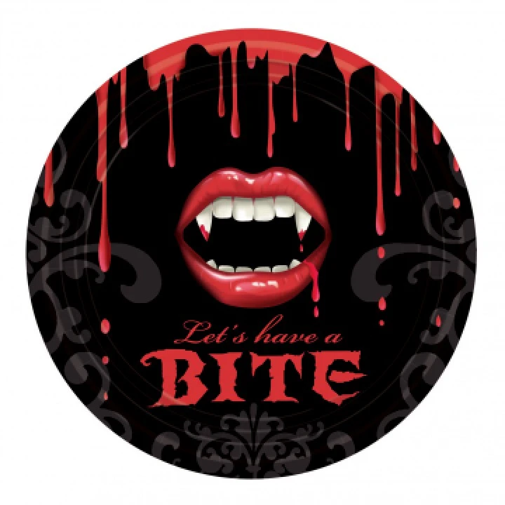 Ce lot de 8 assiettes jetables bouche de vampire Halloween  D 23 cm est idĂ©al pour votre soirĂ©e halloween. Ce lot comprend 8 Ă©tonnantes assiettes en carton de 23 cm de diamètre avec un fond noir, une frise de sang dĂ©goulinant sur une partie du pourtour et au centre une grande bouche rouge ouverte avec des dents de vampires  blanches d’oĂą coule du sang et en-dessous l’inscription en rouge Let’s have a Bite (prĂŞt pour la morsure). Ces belles assiettes bouche de vampire orneront votre table oĂą buffet halloween et avec cette vaisselle jetable pas de soucis après la fĂŞte. Vous voulez des assiettes originales sur le thème halloween, c’est ce lot de 8  assiettes jetables bouche de vampire Halloween qu’il vous faut.