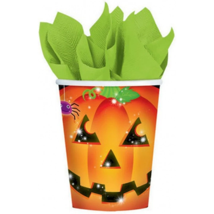 Ce lot de 8 gobelets jetables Citrouille Halloween 26,6 cl sera parfait pour votre table ou buffet halloween. Ces  beaux gobelets orange sont dĂ©corĂ©s avec les yeux, le nez et la bouche noirs de la citrouille avec effet 3D. Ces gobelets  jetables  sont en carton et ont une contenance de 26,6 cl. Ces gobelets en carton très joliment colorĂ©s, seront idĂ©als pour servir les boissons sans crainte de casse. Ils participeront Ă©galement Ă la dĂ©coration de votre table ou buffet Halloween et avec cette vaisselle jetable, plus de soucis après la fĂŞte. Choisir ce lot de 8 gobelets jetables citrouille Halloween 26,6 cl, c’est faciliter  votre organisation et assurer votre dĂ©co Halloween.